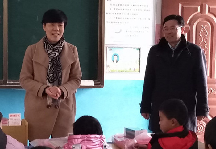 校长张莉、副书记蔡之让到城阳村小学慰问小学生,发放书包等学习用品