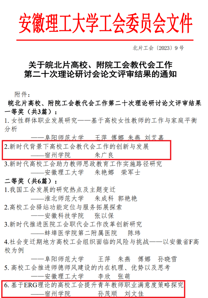 皖北片高校、附院工会教代会工作第二十次理论研讨会于近日举办,本次研讨会共产生一等奖3名,二等奖6名,三等奖8名。其中,我院信息工程学院朱广良老师撰写的论文《新时代背景下高校工会教代会工作的创新与发展》荣获一等奖,商学院孙茂顺、刘文佳老师撰写的论文《基于ERG理论的高校工会提升青年教师职业满意度策略探究》荣获二等奖。