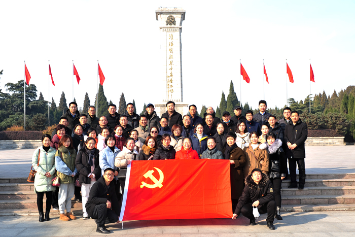 在淮海战役双堆集烈士纪念碑前,同志们驻足瞻仰,默哀致敬,在党委组织部副部长张劲松的带领下,面对鲜红党旗,庄严举起右拳,重温入党誓词,向党宣誓,再次提醒自己要时刻牢记党员身份,不忘初心、牢记使命。